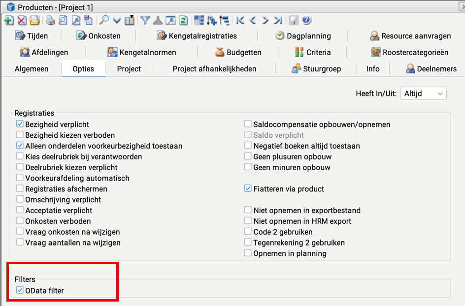Om dit op de juiste manier in te stellen is het noodzakelijk om op alle producten die productieve uren weergeven het vinkje AAN te zetten bij OData filter. Alleen dan worden deze uren meegenomen. Dit filter is terug te vinden op het tabblad Opties van een product en in de het standaard-product.